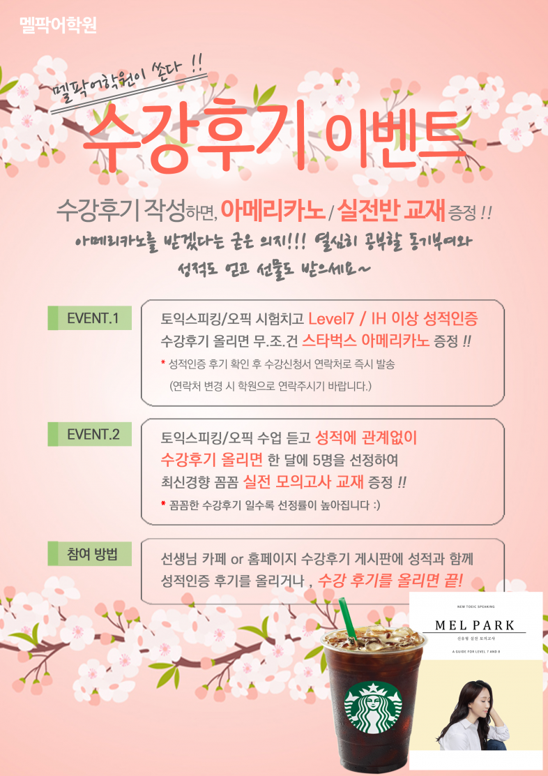 이벤트 | 멜팍어학원 수강후기 이벤트~! 페이지 정보 작성자 MELPARK 작성일16-03-15 11:07 조회3,942회 댓글0건 이전글 다음글 검색 목록 본문 멜팍어학원 성적인증/수강후기 이벤트~!!성적향상을 위한 동기부여와 함께아메리카노 받고 실전반 교재로 고득점 노려보세요~!! 댓글목록 등록된 댓글이 없습니다. 이전글 다음글 검색 목록