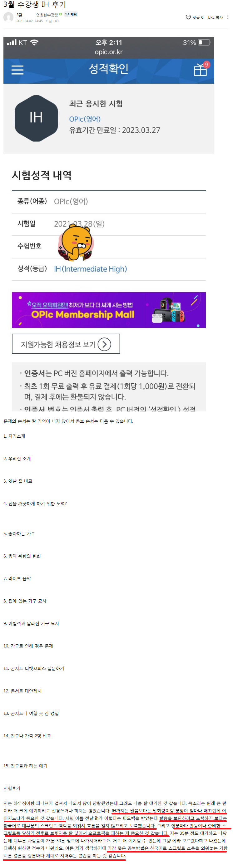 오픽 | (대구오픽 IH후기) 제싸쌤의 만능스크립트로 공부해서 오픽 고득점 받았어요~! 페이지 정보 작성자 MELPARK 작성일21-04-30 19:21 조회5,547회 댓글0건 이전글 다음글 목록 본문 #멜팍어학원 #제싸오픽 #대구오픽 #대구오픽학원 이전글 다음글 목록