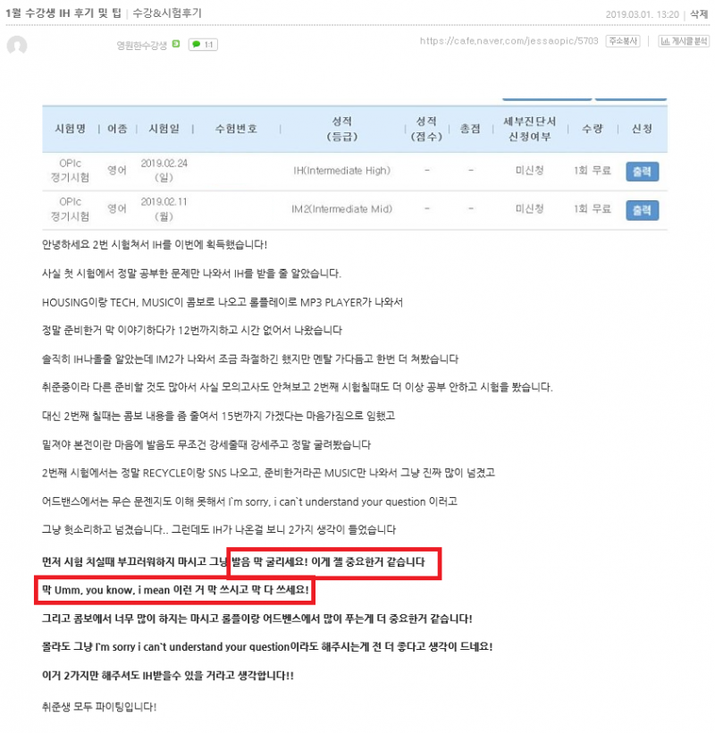 안녕하세요 2번 시험쳐서 IH를 이번에 획득했습니다!
