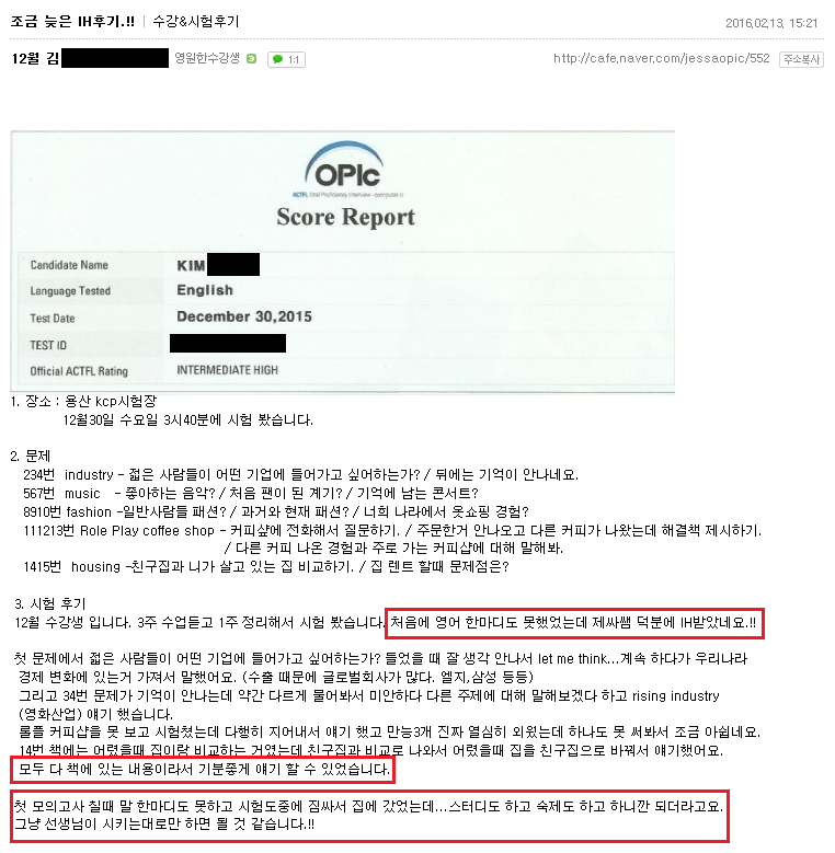 오픽 | (대구오픽 IH후기) 처음에 영어 하나도 못했는데..선생님 덕분에 IH 획득!! 페이지 정보 작성자 MELPARK 작성일16-02-17 11:22 조회4,038회 댓글0건 이전글 다음글 목록 본문 (클릭 하시면 크게 보실 수 있습니다.) 수강생 후기 입니다. 더 많은 후기는 우측 카페 링크 가입 후 보실 수 있습니다. 이전글 다음글 목록